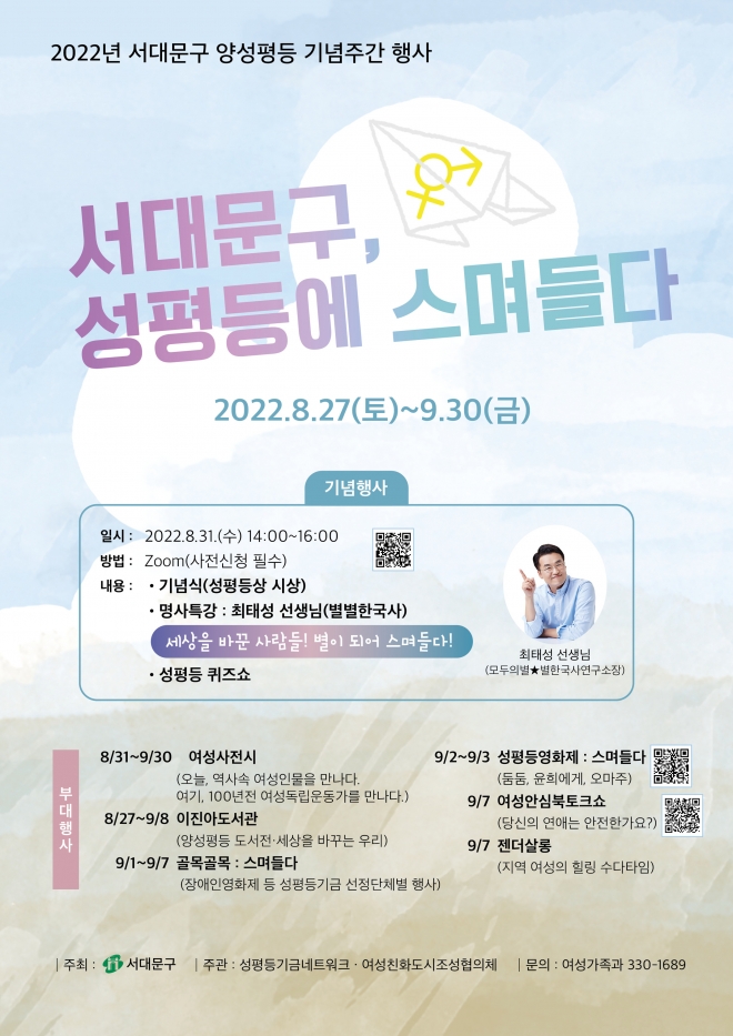 서울 서대문구가 양성평등기념주간(9월 1~7일)을 맞아 오는 27일부터 다음 달 30일까지 다양한 문화 행사를 연다고 22일 밝혔다.