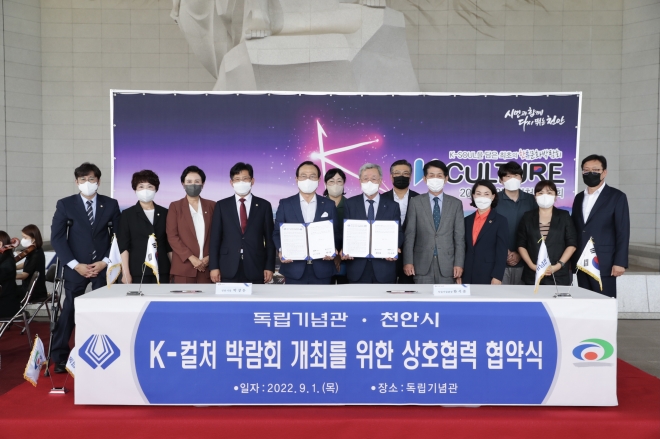 천안시는 1일 독립기념관과 ‘K-컬처 박람회’ 개최 상호협력을 위한 양해각서(MOU)를 체결했다. 이번 협약은 천안시가 민족정신 및 문화를 상징하는 독립기념관에서 한국의 영화·드라마, 웹툰, 패션 등 다양한 한류 콘텐츠를 공연·전시하고 체험하는 행사 개최를 목적으로 한다.