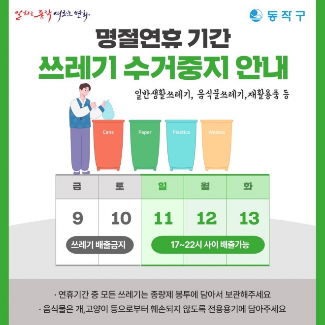 청소대책으로는 9~10일 생활 쓰레기 수거 업무가 일시 중단되는 만큼 주민 불편을 최소화하기 위해 연휴 시작 전 페기물을 전량 수거한다. 이후 11일 오후 5~10시 사이 배출하면 되며 연휴 중에도 주요 대로변과 민원 발생 지역은 특별수거 클린기동대를 운영한다. 마지막으로 물가안정대책 종합상황실을 운영해 성수품 수급 및 가격 동향을 파악하고 부당거래행위 등을 점검할 계획이다.