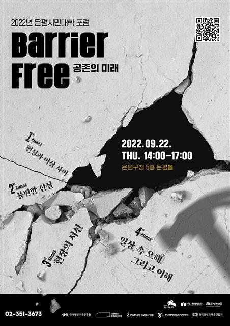 포럼은 ▲한양대 유영만 교수 ‘평생학습의 현실. 생각의 장벽을 부수다’ ▲대구경북연구원 이정미 기획경영실장 ‘지금 우리 사회. 사회의 장벽을 부수다’ ▲서부장애인종합복지관 공선애 사회복지사 ‘지금 우리 은평. 지역의 장벽을 부수다’ ▲장애인학생지원네트워크 김형수 총장 ‘지금 우리 일상. 심리적 장벽을 부수다’ ▲서울여대 신민선 교수 ‘모든 사각지대를 부수고 공존의 미래로 나아가다’ 순으로 진행된다.