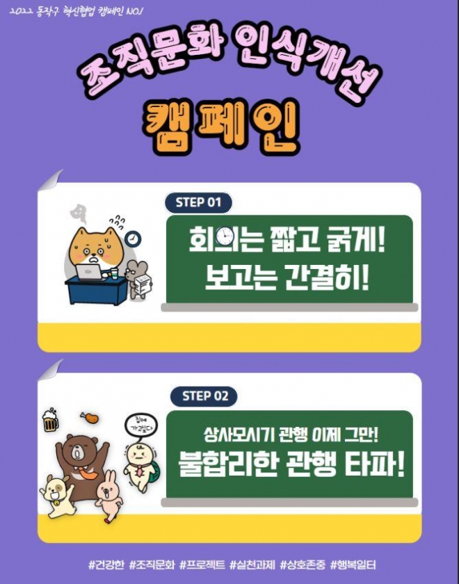 박일하 동작구청장은 “수평적인 조직문화 정착을 위해서는 전 직원 모두 자유롭게 의견을 교환하고 서로 이해·공감하는 것이 중요하다”며 “솔선수범의 자세로 직원들의 목소리를 경청하고 조직문화 혁신에 앞장서겠다”고 말했다.