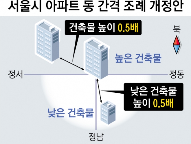 이번 조례 개정으로 같은 대지에서 두 동 이상의 건축물이 마주 보고 있는 경우 창문 등이 있는 벽면으로부터 직각 방향으로 건축물 높이의 0.5배 간격을 띄우도록 개선된다. 기존에는 아파트 동 간격 기준은 건물 높이의 0.8배였다.