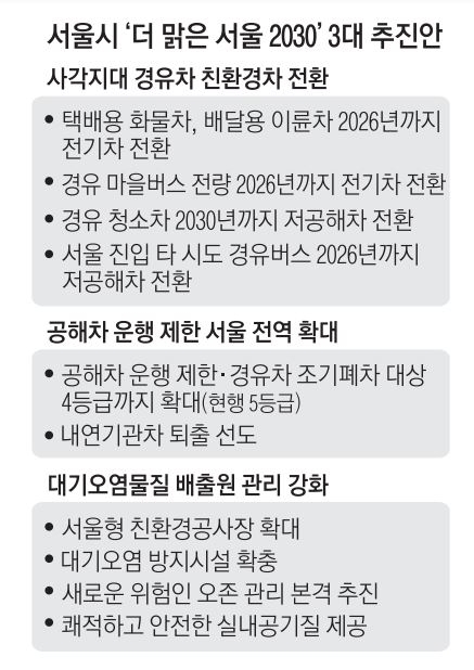생활 주변에서 대기오염물질을 배출하는 공사장, 건설기계 부문 등에 대한 관리도 강화한다. 노후 건설기계 사용제한 환경영향평가 대상을 현재 면적 10만㎡ 이상의 대규모 공사장에서 2025년에는 1만㎡ 이상의 공사장으로, 2030년부터는 1000㎡ 이상의 비산먼지 발생 공사장으로 확대한다. 지하철도 2030년까지 초미세먼지 30㎍/㎥ 이하 달성을 목표로 시설 개선을 추진한다. 시는 이번 대책으로 대기질 개선뿐 아니라 2만 8000개의 일자리 창출과 8조 4000억원 규모의 생산유발 효과가 나올 것으로 기대하고 있다.