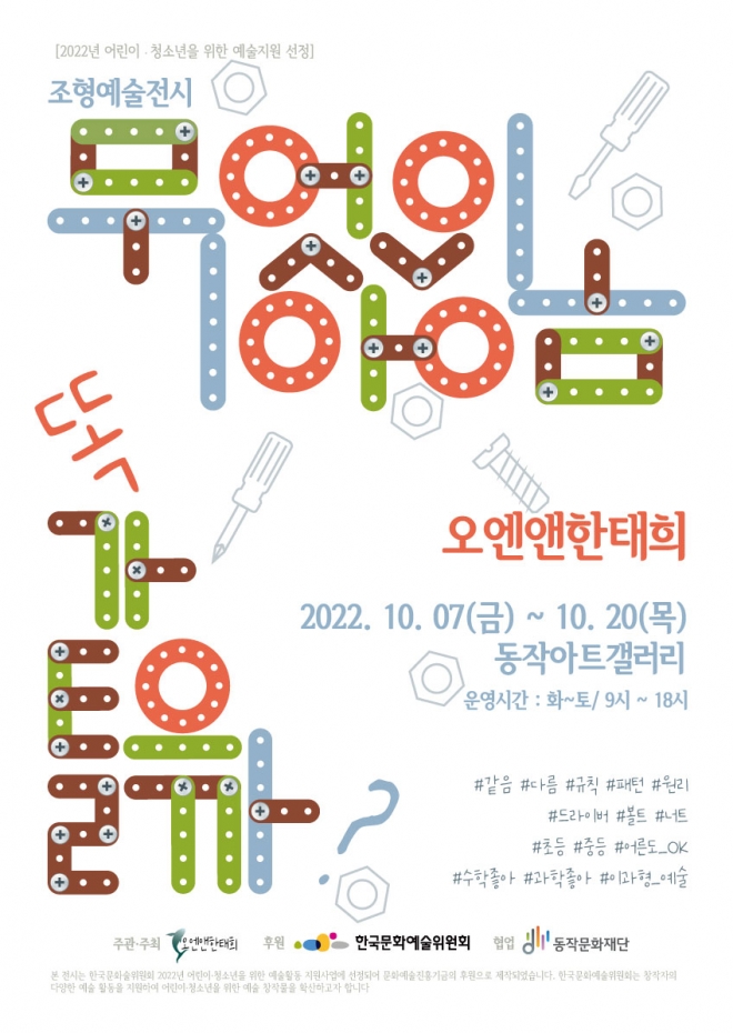 한국문화예술위원회 2022 어린이·청소년을 위한 예술지원에 선정된 조형예술전시 ‘무엇이 무엇이 똑같을까’가 이달 20일까지(화~토요일) 동작아트갤러리에서 열린다. 이번 전시는 한태희 작가의 개인전으로 어린이와 청소년이 수학 원리를 깨닫고 같음과 다름 그 가운데서 나의 고유성이 무엇인지를 탐색해 보길 바라며 기획했다.