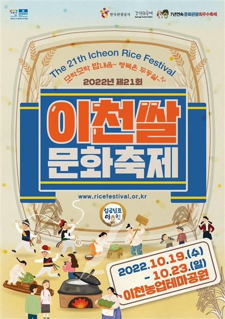 전통 농경문화축제인 제21회 이천쌀문화축제(포스터)가 19일 경기 이천농업테마공원에서 막을 올린다. 오는 23일까지 ‘모락모락 밥내음, 행복은 두둥실’을 주제로, 13개의 테마로 구성된 마당을 통해 다채로운 볼거리, 먹거리, 즐길거리를 제공한다. 축제는 오전 10시부터 오후 6시까지 운영된다.