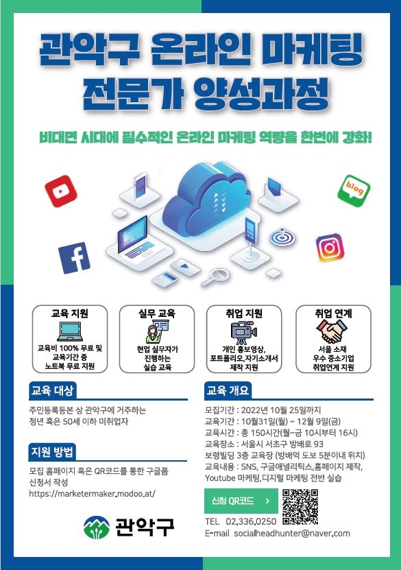 온라인마케팅 전문가 양성교육은 10월 31일부터 12월 9일까지 주 5일 5시간씩 진행하며 서울동북권기업발전협회에서 교육한다. 디지털마케팅 및 트렌드 이해, 홈페이지 제작, SNS 광고 등 이론 및 실습을 교육하며 모집정원은 20명이다.