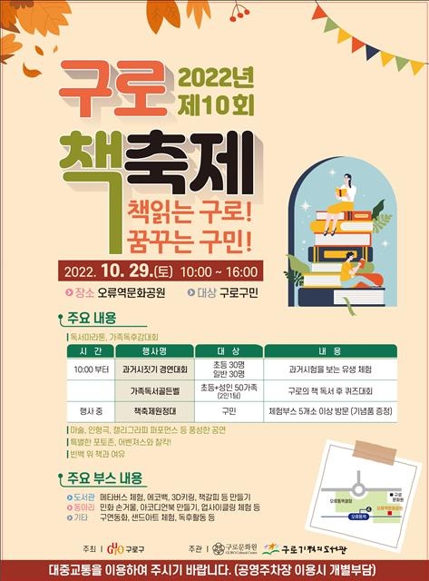 초등학생과 성인 가족 구성원이 2인 1조로 팀을 이뤄 문제를 푸는 ‘가족 독서 골든벨’도 열린다. 총 50팀이 참가하며 사전에 공지한 선정 도서 4권과 관련된 문제의 정답을 맞히게 된다. 행사장에서는 마술 공연을 비롯해 극단 씨앗이 선보이는 인형극 ‘꼼지와 왕콧구멍’도 관람할 수 있다. 지역 도서관과 독서 동아리가 마련한 각종 체험 행사와 먹거리 장터 등도 즐길 수 있다. 문헌일 구로구청장은 “오랜만에 대면으로 축제를 여는 만큼 더욱 풍성하게 준비했다”며 “주민들이 이번 축제를 통해 책을 다채롭게 즐길 수 있을 것으로 기대한다”고 말했다.