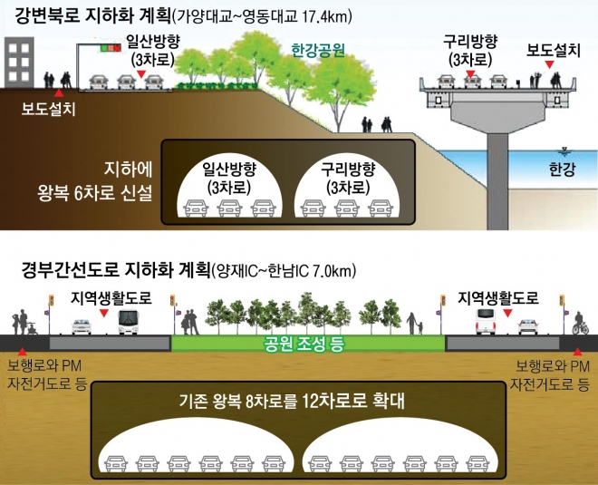 시는 올해 지하화에 대한 타당성 조사 및 기본계획 용역을 끝내고 2024년 이후 설계 및 공사에 들어간다는 방침이다. 강변북로는 2026년 착공해 2031년 완공한 뒤, 경부간선도로는 2028년 착공해 2033년 완공한 뒤 상부 공사가 진행될 것으로 전망된다.