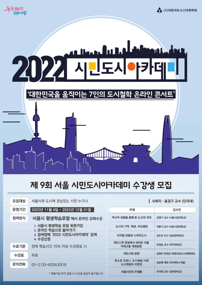 조남준 서울시 도시계획국장은 “배움의 장을 통해 미래도시가 나아가야 할 방향을 시민과 함께 모색할 것”이라며 “시민 여러분의 많은 관심과 참여를 바란다”고 말했다.