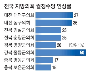 전국 지방의회 월정수당 경쟁적 인상… 불황인데 37% 올린 곳도