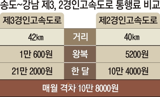 7일 인천시의회 이강구 의원에 따르면 2010년 5월 민자도로로 개통한 제3경인고속도로의 통행료는 한국도로공사에서 운영하는 제2경인고속도로의 통행료보다 2배가량 비싸 매일 이용해야 하는 출퇴근 시민들의 불만이 높다.