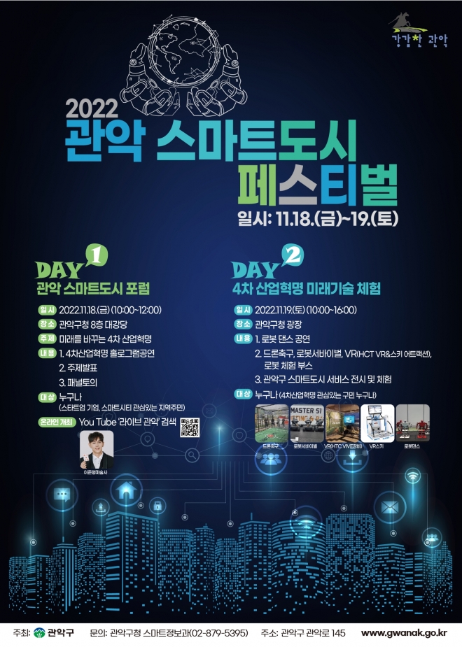 올해 처음 열리는 스마트도시 페스티벌에서는 첨단 정보통신기술(ICT)을 활용한 관악구 스마트도시 사업 추진 현안과 해결방안을 모색하는 담론의 장이 마련된다. 18일에는 ‘미래를 바꾸는 4차 산업혁명’을 주제로 포럼을 연다. ICT 신기술인 홀로그램 공연을 시작으로 김익회 국토연구원 센터장의 ‘4차 산업혁명과 스마트시티’, 서덕수 한동대 교수의 ‘모빌리티 혁신과 도시경관의 미래’로 발표가 이어진다. 또한 사물인터넷(IoT), 인공지능(AI), 빅데이터 등 스마트 분야 전문가들의 패널토의를 통해 스마트도시 구현을 위한 정책 방안이 논의된다.