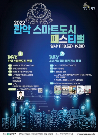 올해 처음 열리는 스마트도시 페스티벌에서는 첨단 정보통신기술(ICT)을 활용한 관악구 스마트도시 사업 추진 현안과 해결방안을 모색하는 담론의 장이 마련된다. 18일에는 ‘미래를 바꾸는 4차 산업혁명’을 주제로 포럼을 연다. ICT 신기술인 홀로그램 공연을 시작으로 김익회 국토연구원 센터장의 ‘4차 산업혁명과 스마트시티’, 서덕수 한동대 교수의 ‘모빌리티 혁신과 도시경관의 미래’로 발표가 이어진다. 또한 사물인터넷(IoT), 인공지능(AI), 빅데이터 등 스마트 분야 전문가들의 패널토의를 통해 스마트도시 구현을 위한 정책 방안이 논의된다.