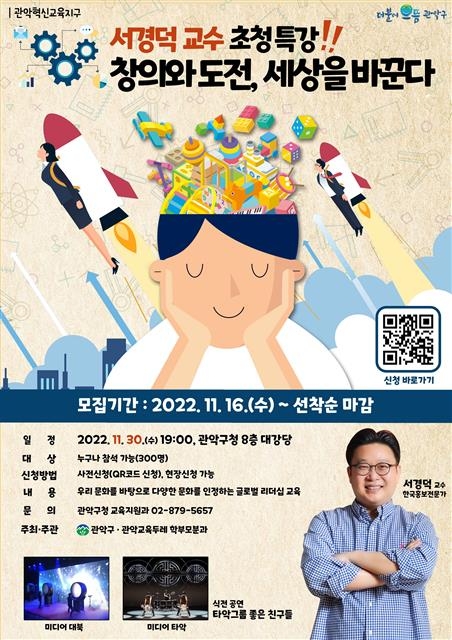 오는 30일 오후 7시 관악구청 8층 대강당에서 열리는 이번 강연에서는 서 교수가 전 세계를 누비며 경험한 생생한 사례를 토대로 급변하는 미래사회에 글로벌 인재가 갖춰야 할 중요한 역량이 무엇인지 들려줄 예정이다. 구는 청년들이 글로벌 에티켓, 창의적 사고, 적극적 실행력 등의 글로벌 역량을 갖춘 리더로 성장하고 넓은 세상에서 더 많은 기회를 잡을 수 있는 계기를 마련하고자 이번 강연을 준비했다.
