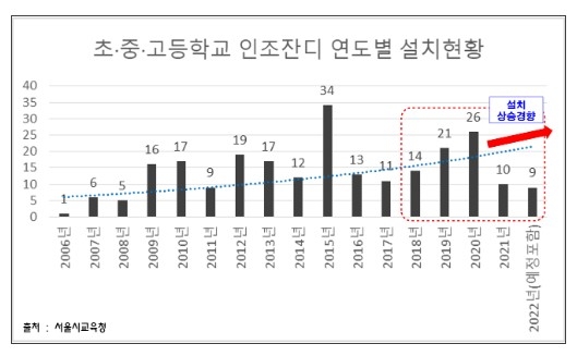 그리고 2006년부터 2022년 까지의 초·중·고등학교의 연도별 인조잔디 설치 경향에 대해 꾸준히 상승 추세인 것을 언급하고, 과거부터 꾸준히 설치 요구가 있음을 확인했다.