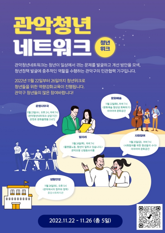 행사에는 누구나 참여가 가능하고 문의는 관악구청 청년정책과로 하면 된다. 교육이 종료된 이후에는 12월 7일부터 9일까지 유튜브 ‘라이브 관악’ 채널을 통해 해당 교육 영상을 시청할 수 있다.