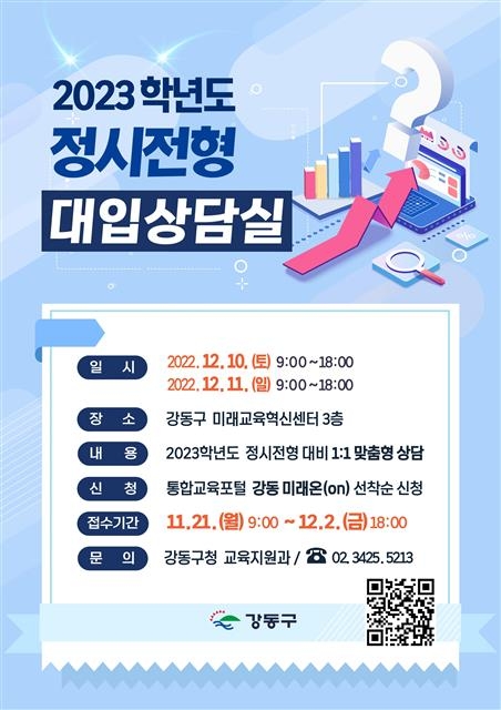 정시전형 대입상담실 참여 신청은 다음달 2일까지 통합교육포털 강동 미래온 홈페이지에서 할 수 있다. 선착순으로 신청을 받는다. 자세한 사항은 강동 미래온 홈페이지에서 확인하거나 강동구청 교육지원과로 문의하면 안내받을 수 있다.