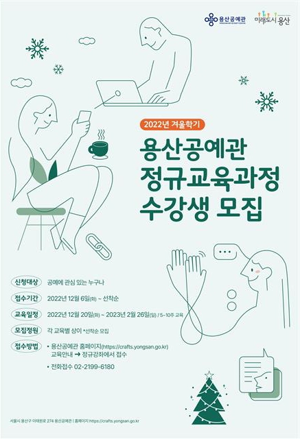 서울 용산구가 ‘2022년 겨울학기 용산공예관 정규교육과정’(포스터)을 개설하고 수강생을 모집한다고 5일 밝혔다. 개설 과정은 6개 분야 33개 반이다.