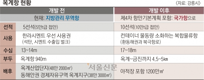 개발의 중심인 옥계항은 천혜의 항구다. 동해의 거친 파도를 막아 주는 오목한 만 형태로 어떠한 배의 접안도 가능한 지형으로 이뤄져 있다. 지방관리 무역항인 옥계항은 현재 582만 7000㎡에 수심 13~14m로 5만t급 배가 접안할 수 있다. 5선석 규모로 1991년부터 한라시멘트가 우선 사용권을 갖고 시멘트 무역의 전진기지로 이용 중이다. 석탄과 시멘트를 운반하는 벌크항이다. 배후에는 옥계산업단지(48만 2000㎡)와 아직 기업 유치가 저조한 동해안권 경제자유구역 옥계지구(38만 3000㎡) 등이 있다. 이곳을 포항과 울산항에 버금가는 대단위 국가항으로 개발하겠다는 게 김 시장의 포부다. 우선 옥계항을 금진 지역까지 확대해 접안 시설을 10선석으로 늘리겠다는 복안이다. 10만t급의 배가 드나들 수 있도록 부두 길이는 4.5~5㎞로 늘리고 수심도 17~18m로 준설할 계획이다.