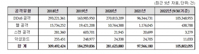 이경숙 서울시의원(국민의힘·도봉1)이 공개한 자료에 따르면 서울교통공사가 2018년 1월부터 2022년 9월까지 약 9억 8만 건의 해킹 공격을 받았다. 하루 평균 약 57만 건에 달하는 수치다.