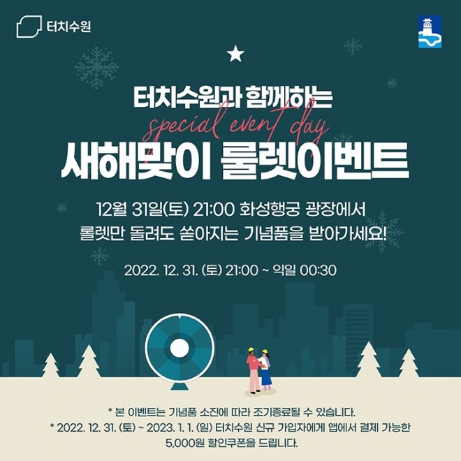 시 관계자는 “2023년 계묘년을 맞아 희망과 행복이 가득한 한 해가 될 수 있도록 ‘새해맞이 룰렛이벤트’ 등 다양한 행사를 준비했다”며 “쉽고 간편하게 관광정보를 얻을 수 있는 ‘터치수원’ 앱이 많은 사랑을 받아 수원시가 스마트한 관광도시로 자리매김하길 바란다”고 말했다.