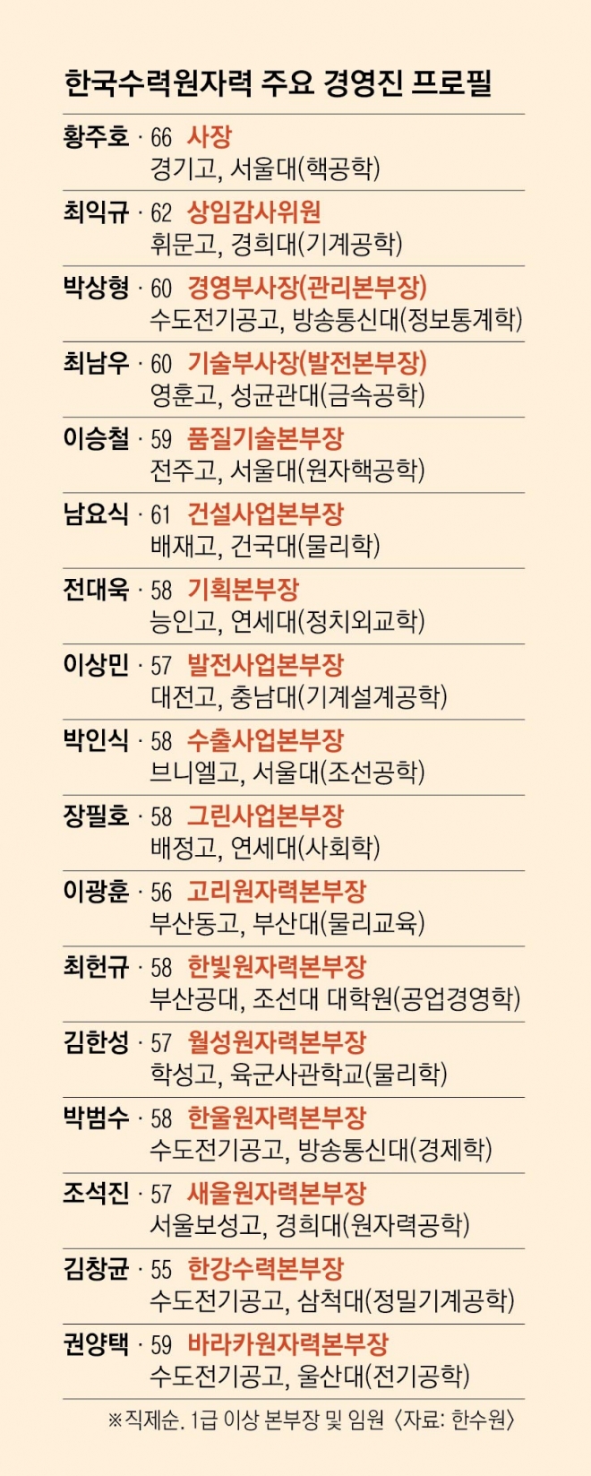 건설사를 나온 최익규(62) 상임감사위원은 휘문고, 경희대 기계공학과를 나왔다. 동갑내기 부사장인 박상형(60) 경영부사장 겸 관리본부장과 최남우(60) 기술부사장 겸 발전본부장은 정재훈 전 한수원 사장의 두터운 신임을 받으며 발탁됐다. 외향적인 성격의 박 부사장은 수도공고, 방송통신대를 나와 IT정책경영학으로 박사 학위를 받았다. 영훈고와 성균관대 금속공학과를 나온 최 부사장은 정통 엔지니어로 한빛·월성원자력본부 발전소장을 지낸 실력 있는 발전 전문가로 불린다.