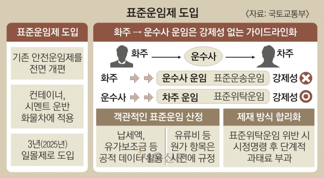 이번에 도입하는 표준운임제에선 화주·운송사 간 운임 계약에 강제성을 없앴다. 대신 매년 가이드라인만 제시하기로 했다. 특히 화주는 과태료 대상에서 제외해 처벌 조항을 없앴다. 다만 운송사·차주 간 운임은 표준위탁운임을 통해 그대로 강제한다.