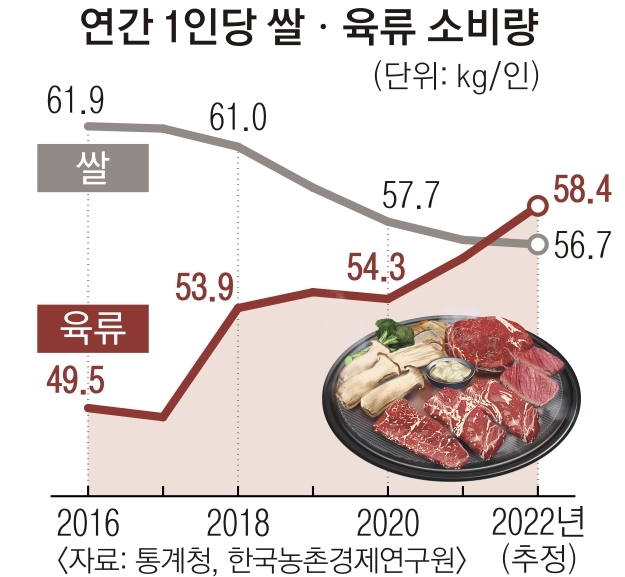 한국농촌경제연구원이 최근 내놓은 ‘농업전망 2023’에 따르면 소고기·돼지고기·닭고기 등 3대 육류의 1인당 소비량은 2002년 33.5㎏에서 매년 증가해 지난해에는 58.4㎏으로 추정됐다. 반면 지난해 1인당 쌀 소비량은 통계청의 양곡 소비량 조사 결과 56.7㎏에 불과했다. 육류 소비량이 쌀을 추월한 건 이번이 처음이다. 아침식사 집밥 취식 횟수가 적어지고 배달 및 테이크아웃 의존도가 높아진 게 주된 원인으로 분석된다. 주식이 쌀에서 고기로 바뀌고 있는 것이다.