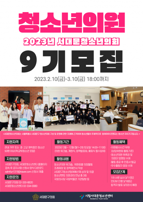 서울 서대문구의회는 올해 서대문청소년의회에서 활동할 ‘9기 청소년 의원’을 모집한다고 16일 밝혔다.