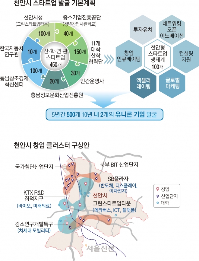 계획안에 따르면 천안시는 창업부터 성장까지 맞춤형 지원으로 5년간 500개 스타트업을 발굴한다. 500개 스타트업 중 최소 2개 기업을 연 매출 1조원 이상의 유니콘 기업으로 키워 낸다는 것이다.