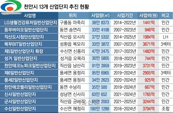 지난해 12월에는 2차전지용 전해액, 반도체·디스플레이 제조용 장비, 자동차·부품 제조 등 6개 기업으로부터 538명의 일자리를 창출할 수 있는 1591억원 규모의 투자를 유치했다. 이들 기업은 성거일반산단지 등에 15만 4180㎡ 규모로 공장을 신축하거나 사업을 확장한다.