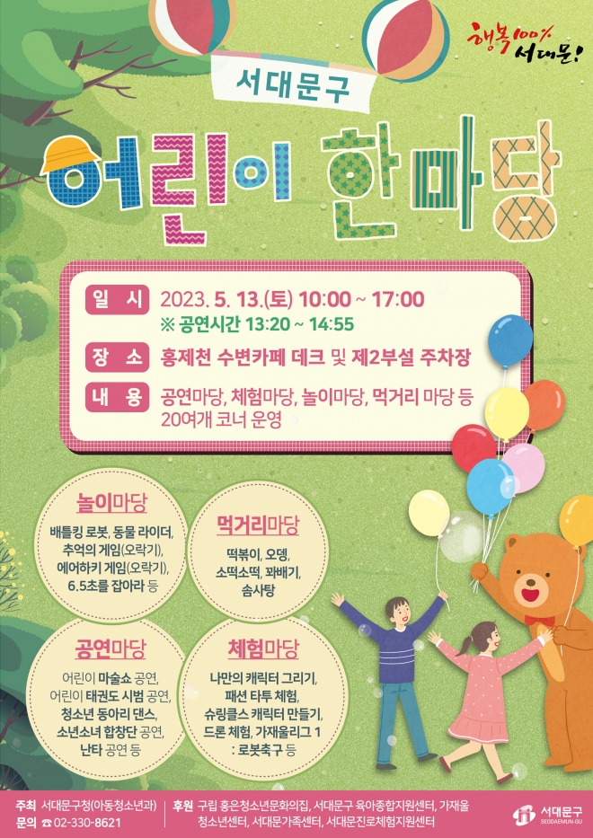 이성헌 서대문구청장은 “가정의 달을 맞아 어린이들에게 즐거움을 주는 행사가 되길 기대한다”며 “어린이가 마음껏 뛰놀 수 있는 환경을 조성하는 데 더욱 힘쓰겠다”고 말했다.