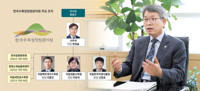 “도시숲과 달리 정원은 계획과 공간에 구애되지 않고 누구나 자유롭게 꾸밀 수 있다는 것이 가장 큰 장점입니다.” 류광수 한국수목원정원관리원(한수정) 이사장은 지난 23일 세종 한수정 본부에서 서울신문과 한 인터뷰에서 ‘정원’의 무한한 확장 가능성을 강조했다. 공공 부문에서 도시계획에 따라 추진되던 기존 녹색공간 조성이 민간으로 확대되고 공간(땅)에 대한 제약이 완화되면서 정원을 향한 시선이 달라졌다.