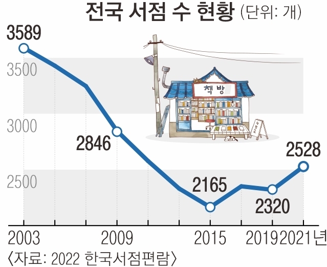 2022 한국 서점 편람에 따르면 국내 서점은 2003년 3589곳에서 2015년 2165곳으로 감소했다. 이후 2019년 2320곳, 2021년 2528곳으로 소폭 늘었다. 하지만 아직도 2021년 기준 서점이 한 곳뿐인 시군구가 29곳에 달한다. 7곳은 서점이 한 곳도 없다.