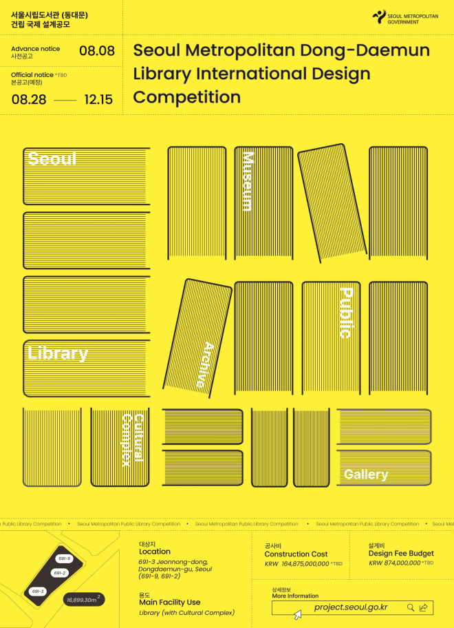 서울시는 가칭 ‘서울시립도서관(동대문)’ 건립을 추진하고 28일부터 12월 15일까지 ‘서울시립도서관(동대문) 국제설계 공모’(포스터)를 실시한다고 7일 밝혔다. 2029년 개관을 목표로 하는 서울시립도서관은 서울시 첫 ‘목구조 건축 시범사업’으로 진행된다. 1만 6899㎡ 부지에 연면적 2만 5000㎡, 야외정원 1만㎡ 규모에 목조와 친환경 건축기법이 결합된 ‘하이브리드 공법’으로 지어질 예정이다. 예정설계비 87억원을 포함해 총 3000억원이 투입되는 대규모 프로젝트다.