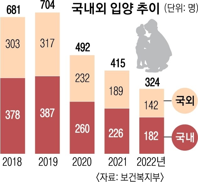 국내 입양 수는 해마다 주는 추세다. 최근 4년간 국내 입양아동 현황을 보면 2019년 국내 387명(국외 317명) →2020년 국내 260명(국외 232명) →2021년 국내 226명(국외189명) →2022년 국내 182명(국외142명) 등으로 점차 줄고 있다. 10여년 전인 2011년 국내 입양아동 수가 1548명(국외 916명)이었던 점을 고려하면 급격하게 감소하고 있다.