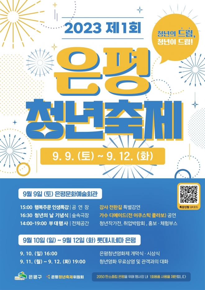 이번 행사는 은평구에서 열리는 첫 공식 청년축제다. 축제는 ‘청년의 날’ 행사를 시작으로 ‘은평청년영화제’ 등 다양한 프로그램으로 진행된다. 특히 청년의 시선에서, 청년의 목소리를 반영한 축제를 만들기 위해 지난 4월부터 청년들이 직접 ‘은평청년축제위원회’를 구성해 행사를 기획하고 준비했다.