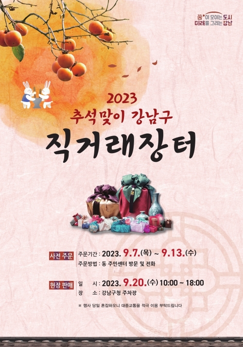 조성명 강남구청장은 “추석을 맞아 전국에서 온 우수한 지역 특산물을 저렴하게 구매할 수 있도록 준비했다”며 “직거래 장터를 통해 추석 명절을 알차게 준비해 모두 풍성한 한가위 보내시길 바란다”고 말했다.