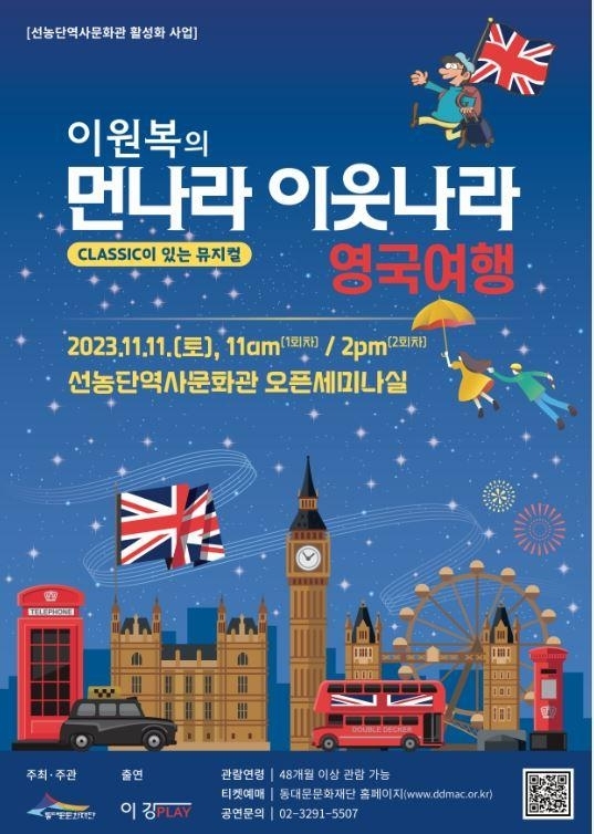 이원복 작가의 베스트셀러 만화를 원작으로 하는 뮤지컬 ‘먼나라 이웃나라-영국여행’은 만화 작가인 빵떡모자 아저씨가 엉뚱발랄 소녀 독자와 함께 책에서만 읽을 수 있었던 영국 역사를 눈앞에서 직접 체험할 수 있도록 시간여행을 떠난다는 내용이다. 선농단역사문화관을 주민들에게 널리 알리기 위한 활성화 사업의 하나로 열린다.