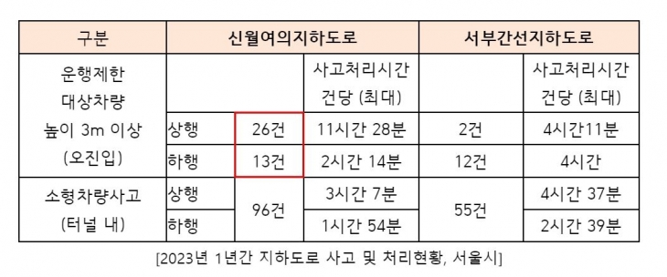 지난 2023년 신월여의지하도로 오진입 사고 39건으로 서부간선지하도로 14건의 약 3배