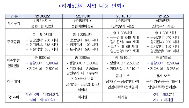 서울시는 지난 2021년에 국비 약 435억원이 지원되면 시비로 약 400억원을 지원할 계획이었지만, 중간에 정부의 국비 지원이 중단되자 서울시도 시비 지원 계획을 없앴고, 예산을 핑계로 생활SOC 면적을 절반 넘게 줄였다. 원래 총 5504㎡ 면적에 공동육아방, 취약청년지원센터, 어르신 청춘카페, 각종 센터 등이 들어설 예정이었으나 2500㎡로 줄어들게 됐다.