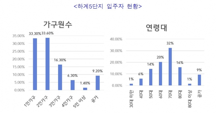 재건축의 특성상 원주민들은 이주 후 재입주해야 한다. 하계5단지는 이주단지를 지으려 했지만, 서울시의 재정 지원이 중단되고 신속함을 내세운 오 시장의 지시로 거주지와 멀리 떨어진 주택으로 뿔뿔이 흩어져야 하는 안타까운 상황이다. 하지만 주민들은 30년 넘게 공동체를 형성하고 서로 의지하는 서로돌봄으로 살아왔기에 뿔뿔이 흩어지기를 원하지 않고 있다. 입주자 현황을 보면 1, 2인 가구가 합쳐서 66.9%나 되며 60대 이상 입주자는 69.4%나 되는 상황이다.