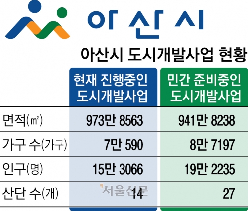 14개 개발지구 추정 인구만 15만명이 넘는다. 아산시 인구는 지난달 38만명을 넘어섰다. 추정대로 진행되면 인구 50만명을 쉽게 웃돌 전망이다.