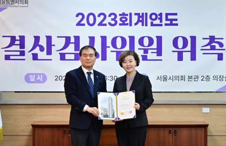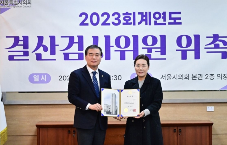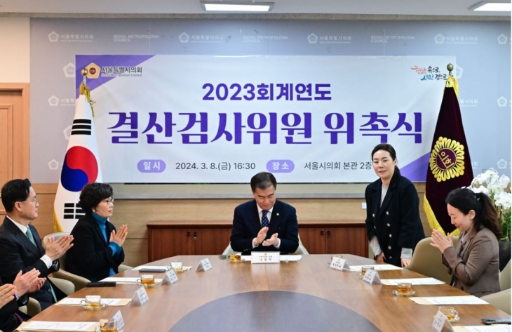 본격적인 예산결산 검사에 들어가기에 앞서 서울시의회는 지난 8일 의회 본관 의장실에서 2023년 회계연도 서울시 결산검사위원 위촉식을 갖고 총 17명의 결산검사위원을 선임했다.
