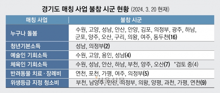 취약계층을 대상으로 반려동물의 의료비, 장례비(1인당 최대 20만원)를 지원하는 사업에는 연천, 포천, 가평, 여주, 의정부 등 5개 시군이 빠졌다. 음식점 위생등급 지정업소에 1곳당 청소비 70만원을 지원하는 사업도 9개 시군이 참여하지 않는다.