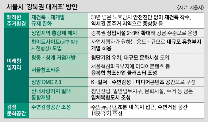 지난달 발표했던 서남권 대개조에 이어 두 번째로 내놓은 서울 권역별 개발 계획이다. 오 시장은 “서남권 대개조 계획이 준공업지역으로 개발하겠다는 내용이라면 강북권 대개조는 상업지역 확대에 초점을 맞췄다”고 설명했다.