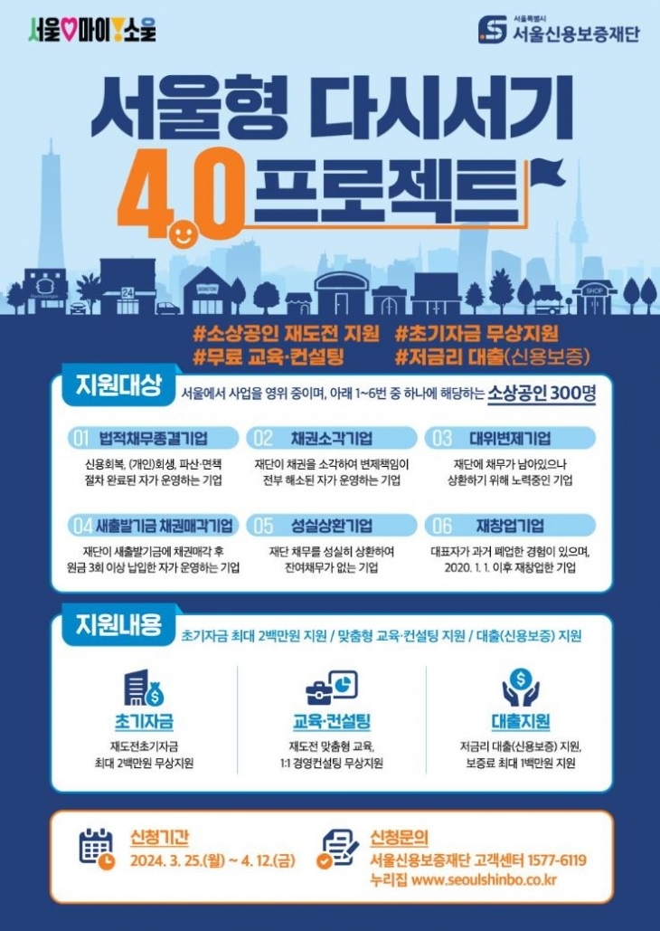 ‘서울형 다시서기 4.0 프로젝트’는 재도전하는 소상공인에게 전문가의 1:1 경영 컨설팅부터 200만원의 사업 초기자금, 저금리 대출지원과 최대 100만원의 보증료 지원까지 꼭 필요한 서비스를 ‘패키지’로 지원하며, 2024년에는 지원 대상자를 폐업 경험이 있는 ‘재창업 기업’, 서울신용보증재단 채무를 성실히 상환완료한 ‘성실상환기업’ 뿐만 아니라, 전액 변제는 못 했으나 법률 등으로 정한 채무상환 책임을 다한 일명 ‘성실실패기업’에 새출발기금 채권매각기업까지 포함, 지원 대상을 확대할 예정이다.