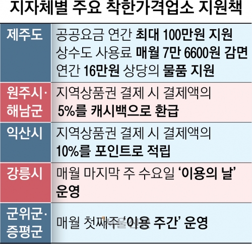 지자체들은 착한가격업소에 대한 인센티브도 강화하고 있다. 제주도는 전기·가스 등의 공공요금 지원액을 지난해 연 최대 89만원에서 100만원으로 11만원 늘렸고, 상수도 사용료 감면액도 매월 7만 6600원으로 전년(6만8000원)보다 1만원가량 높였다. 물품 지원액도 연간 11만원에서 16만원으로 5만원 올랐다.