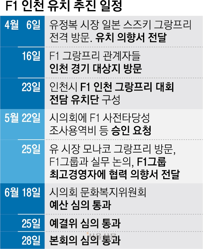 시는 같은 달 23일 ‘F1 인천 그랑프리 대회 전담 유치단’을 구성하고 계약 조건 등에 대한 검토에 들어갔다. 5월 하순에는 유 시장이 그랑프리가 열리는 모나코로 날아가 도메니칼리 CEO를 다시 만나 협력 의향서를 전달하는 등 ‘F1 인천 그랑프리’ 유치에 강한 열정을 내비쳤다.