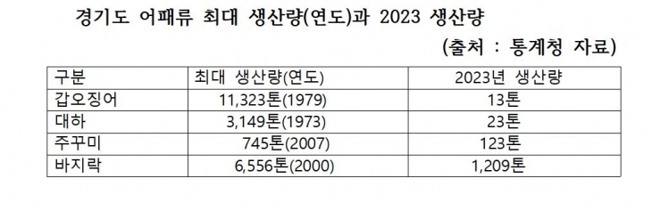 이에 반해 경기 바다에서 사라져 가는 어패류가 적지 않다. 대표적인 어류는 갑오징어다. 지난 1979년 11,323톤의 어획량을 기록했던 갑오징어는 지난해 13톤으로 거의 명맥만 유지했다. 큰 새우(대하)도 1973년 3,143톤에서 지난해 23톤으로 14배가량 줄었다. 주꾸미와 바지락 어획량도 역대 최대 생산량과 비교해 각각 6배와 5배 이상 줄었다.